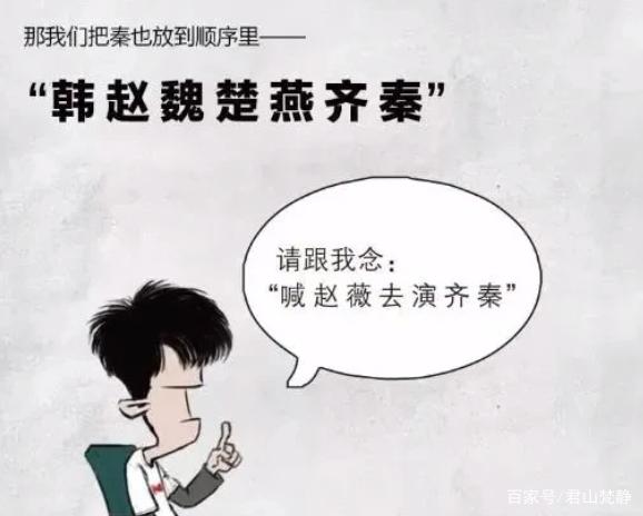 这套作品中令小编印象最深的就是秦灭六国的顺序被陈磊改编成“喊赵薇去演齐秦”,对应的也就是“韩赵魏楚燕齐”,这样的谐音梗一下子就让大家把这个顺序记住了。