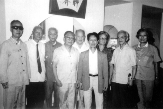 《英语世界》编辑部招待撰稿人并合影。左一许渊冲,左二李赋宁,左三许梦熊,左四裘克安,右四陈羽纶(主编),右三赵萝蕤,右二卞之琳,右一沈师光(编辑)