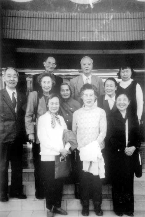 海源寺合影。前排:右一关一贤(又名关懿娴,后为北京大学教授),右二卢如莲(演过英文剧女主角萝芝),右三林同珠,右四林同端;后排:右一朱树飏(后为解放军外国语学院英语系主任),右二卢福庠(作家,曾陪巴金来西南联大开座谈会),右三林秀清(后为复旦大学法语系主任),右四刘缘子(后为天津外语学院教授),右五刘笑娟(后去美国)。摄影者为许渊冲