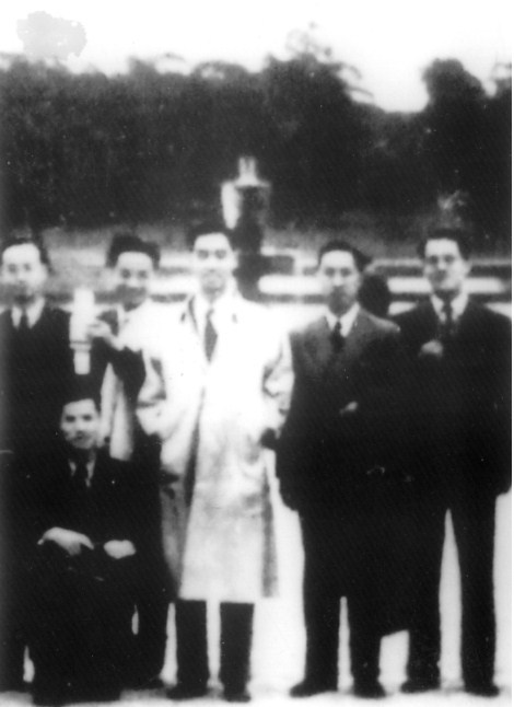 1948年秋留欧同学在巴黎凡尔赛宫花园合影。右一为李廷揆(后为北京外国语大学法语系主任),右二为王佐良(后为北京外国语大学英语系主任),右三为许渊冲,左一为卢浚(后为昆明师范学院院长),前蹲者为林宗基(后为北京第二外国语学院教授)