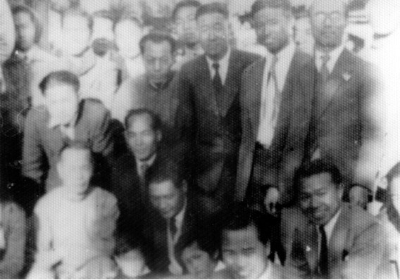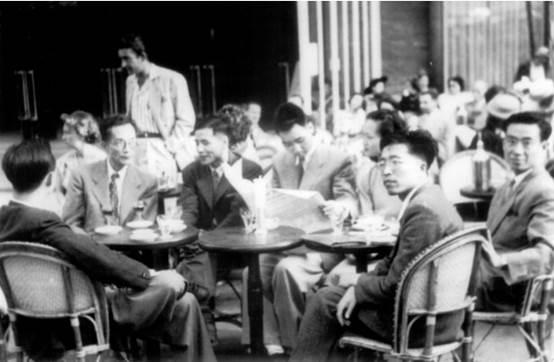 1949年西南联大留法校友在香榭丽舍林荫大道露天咖啡馆欢迎清华大学梅贻琦校长留影,从左至右分别是:卢浚、梅贻琦、林宗基、许渊冲、何申、田方增、吴其昱