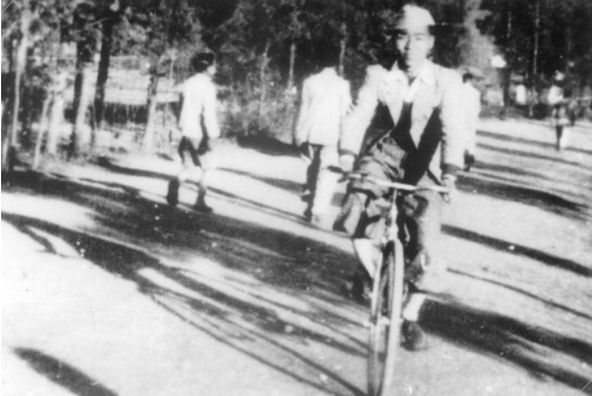1941—1942年许渊冲在美国援华志愿航空队担任英文翻译,照片为许渊冲在航空队所住的招待所外公路上骑车