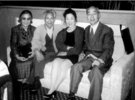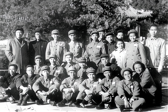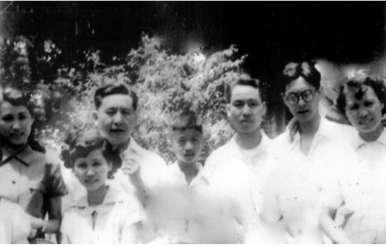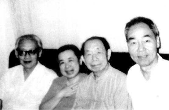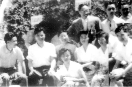 1957年6月30日在北京大学与红线女三姐妹合影。左一为红线女,左二、左三为二姐夫妇,右一、右二为大姐夫妇,右三为许渊冲