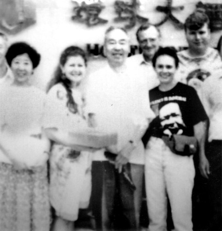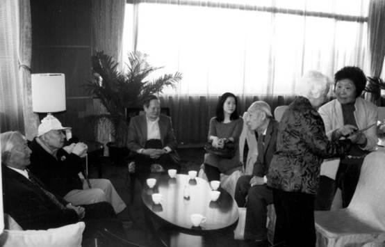 2000年作者(右一)与表叔熊式一在北京外国语大学合影。右二是熊式一(在英国出版有《王宝川》《西厢记》),右三为表妹德兰(出版自传体小说《求》等,赞美许译),右四是北京外国语大学教授周珏良(作者西南联大外文系同学)