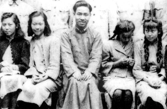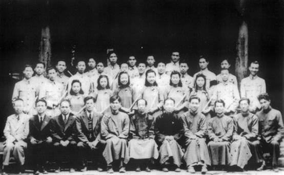 1944年昆明天祥中学毕业班师生合影。前排左一为训育主任施养成,左二为数学教师张燮,左三为导演项粹安,左四为历史老师许寿谔,左五为教务主任章煜然,正中间为李董事长,右五为邓衍林,右四为英文教师许渊冲,右三为国文教师易经香,右二为化学教师章育中,右一为地理教师王立本;第二排站立女生中左二为聂秀芳