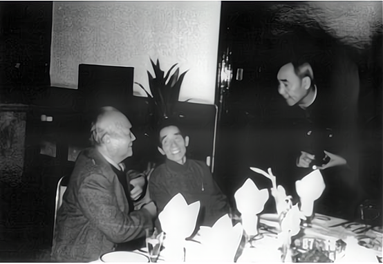 萧乾(左)在北京饭店对许渊冲(右)说:如果诗和分行散文没有分别,怎对得起那些空白?你译的诗是对得起空白的