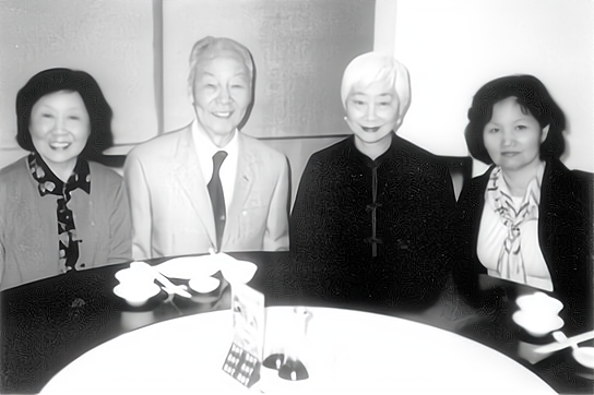 1997年与吴冠中夫妇(左二、左一)谈陆游词《钗头凤》并合影