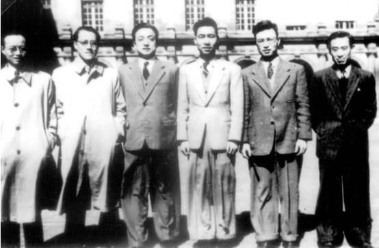 1948年西南联大留法校友在巴黎大学留影。右一吴其昱(后为法兰西科学研究中心研究员),右二王乃梁(后为北京大学地理系主任),右三许渊冲,右四端木正(后为中山大学教授、最高法院副院长),右五李廷揆(后为北京外国语大学法语系主任),左一卢浚(后为昆明师范学院院长)