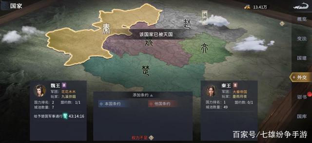 游戏中的“国家”系统就让玩家自行决定国事外交方向,简而言之,喜欢谁就跟谁结盟;不喜欢谁就打谁,甚至能直接将他打到“灭国”。