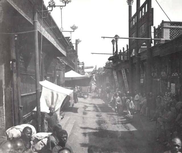 照片记载的是光绪统治中期的时的北京的街景。这是一道热闹的商业街,两边店铺的装饰相当的精美,很多的行人在大街上来来回回,可见当时的商业贸易十分发达。