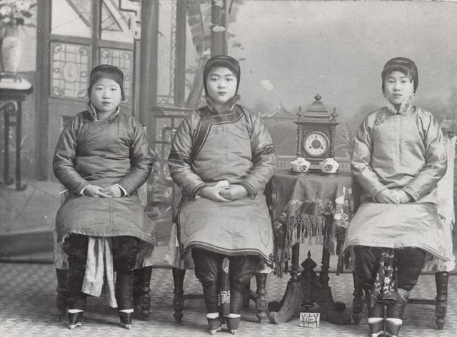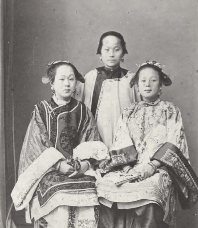 这三名女子在当时可以说是比较时髦的,虽然在现在的眼光看来,她们的装束并不是特别的漂亮,但是在当时这已经相当的时髦了。刘海发型,收身袄裤让她们走在了清朝时尚的最前沿。