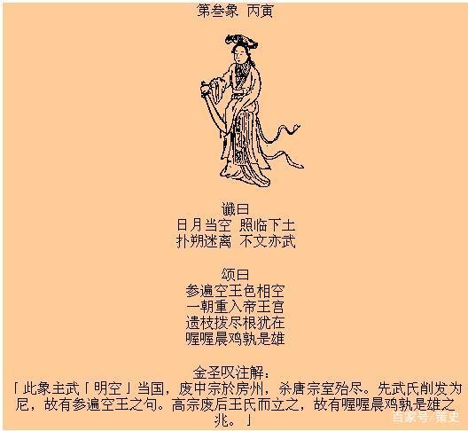 在《推背图》中,袁天罡对武则天称帝的预言,则更为详细。《推背图》一共有六十幅图像,每一幅图都会配一首律诗来作为解释。在第3象的律诗中有这样一句话,“日月当空照临下土,扑朔迷离,不文亦武”。“日月当空”就是“曌”(zhào)字,而是武则天当上皇帝后,刚好就给自己取了“武曌”这个名字。至于“不文亦武”说的便是武则天是来自于武士刀家庭,同时也说明这个人姓武。
