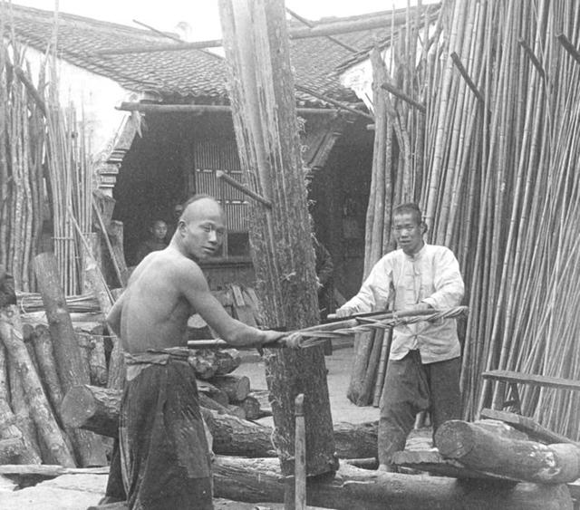 照片中是两个木匠,他们正在锯木板,将原木锯成薄薄的木板,这是一个非常耗体力的工作,而且还有还有很高的要求,需要将木板切成厚薄均匀,所以这是一个技术活。