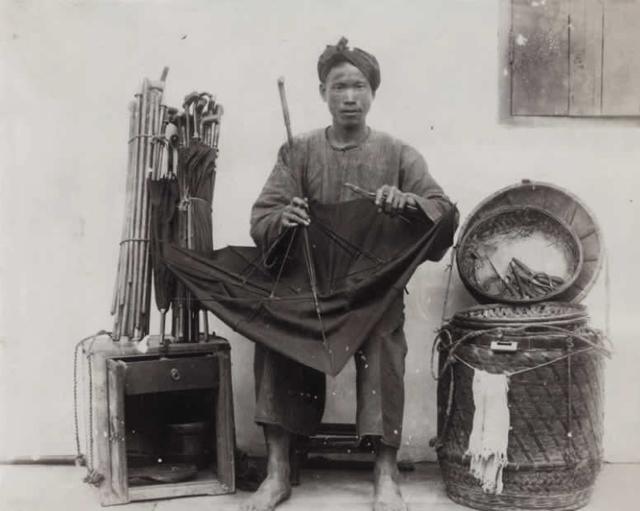 照片中是一位修雨伞的匠人,当时人们用的是油纸伞,这种伞用久了就容易破损。所以就需要这些修雨伞的匠人修好雨伞,他们的手艺相当好,修完之后和新的一样。