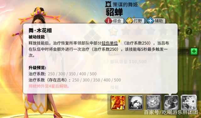 吕布这个游戏人物造型实在无力吐槽,像是实习生做的,在国服环境下没有汉尼拔的情况下推荐培养,国际服这个英雄并不推荐。再来看貂蝉作来副将使用治疗系数是所有紫色英雄中最高的,贞德是450最高,貂蝉则是500最高,同时提升部队攻击力和防御力,对比洛哈专属的野人英雄,伤害技能等更实用一些。