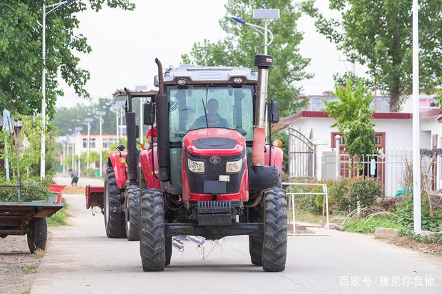 麦收时节,一辆辆大型拖拉机开进雷岗村。