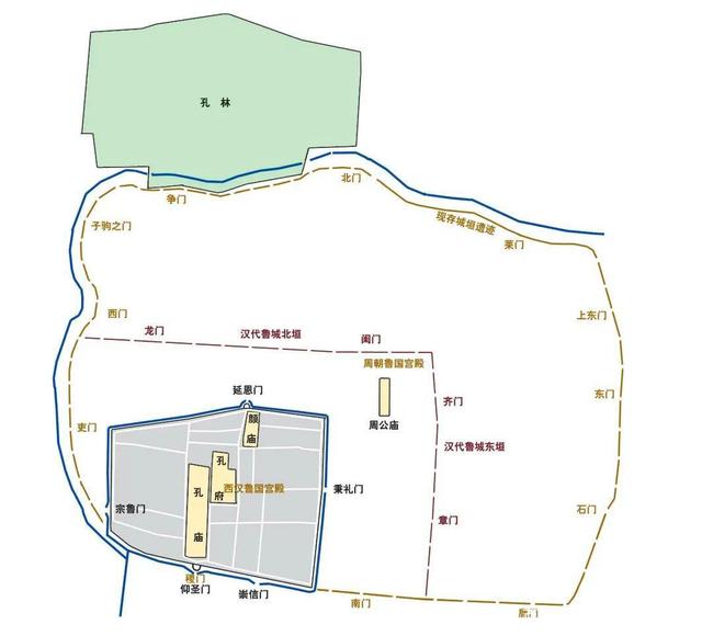 曲阜城垣变迁示意图 。棕色线为周代鲁城范围,红色线为汉代鲁城范围,黑线为明朝正德年间修建的曲阜县城。史料记载,周公的长子伯禽统帅宗族在鲁地进行武装殖民,建起了宫殿、宗庙和城郭,即“曲阜城”。伯禽就国时带来了大量周朝礼仪制度的典籍和执事人员,使得“周礼尽在鲁矣”
