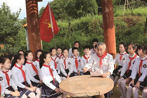 李安田向学生讲述红军“夜宿梨山”的故事。何婷艳 摄