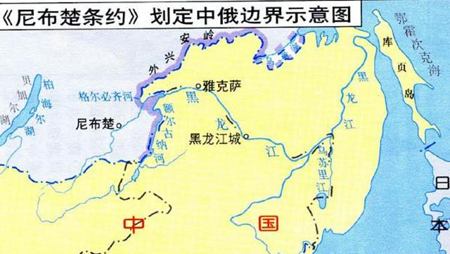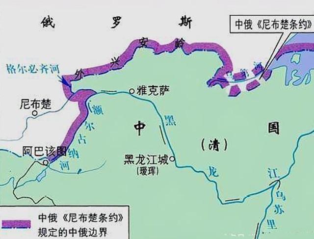《尼布楚条约》规定:从黑龙江支流格尔必齐河到外兴安岭直到海,岭南属于中国,岭北属于俄罗斯。西以额尔古纳河为界,南属中国,北属俄国,额尔古纳河南岸之黑里勒克河口诸房舍,应悉迁移于北岸;
