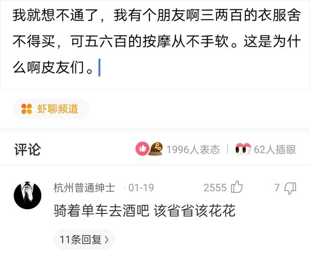 11:我就想不通了,我有个朋友啊三两百的衣服舍不得买,可五六百地按摩从不手软。这是为什么啊朋友们?
