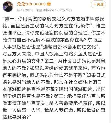 而新娘则理直气壮地说:“在上海办了我最喜欢的日式婚礼。招来一群素质智力低下的网友,说俩中国人办什么日式婚礼。我想说,首先我不是中国人,第二我喜欢日本文化,第三我穿什么不管你们什么事。我花钱办婚礼。轮得着你们这些妖魔鬼怪指指点点?是没受过教育要包容文化差异?建议评论区的酸民们结婚一定要穿凤冠霞帔,不然就是不爱国。”