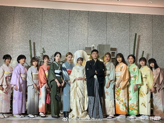 这个日式婚礼是在一个酒店内举办的,当事女主自己在微博上晒出了照片。夫妻二人穿着和服,而11个伴娘也穿着和服一起合影。有网友简单描述以下:一个曾经的中国人,变成了英国人,在中国的土地上,举办了一场日式婚礼。