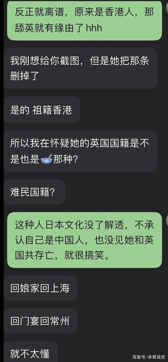 她的对话就说明了:这位女子首先是一位华裔,多少会知道点抗日战争的残酷历史。即使入了英国籍,但她既然选择在中国生活,就要尊重中国的民族感情,何况她嫁的就是一个中国人,还是常州的。这也要顺带着批评她的丈夫,一个传统的中国男子,难道没学过中国近代史?不知道抗日战争的存在?反而助纣为虐。