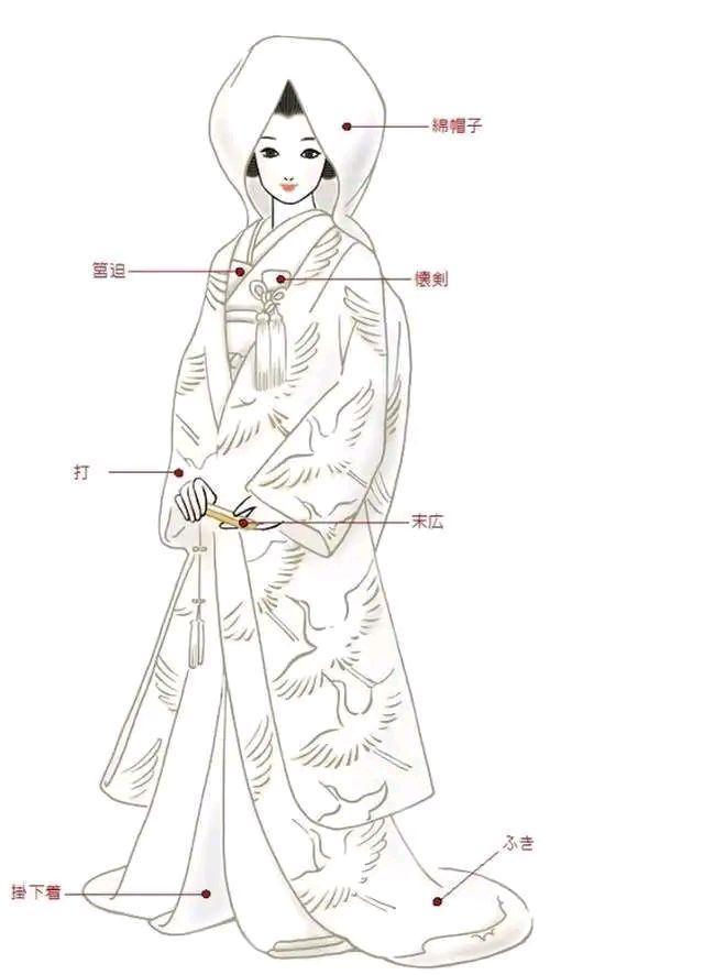 根据照片,新娘的一身“白无垢”显得格外扎眼。所谓白无垢就是日本新娘出嫁的礼服,是从内到外全是白色的和服,打褂、褂下、振袖、腰带、布袜乃至佩戴的小物件都是白色。这点和我们的传统婚俗有巨大差别,毕竟中国新人结婚是需要穿红色礼服或者西式礼服的。而日本的“白无垢”看着就像中国白事上的丧服。