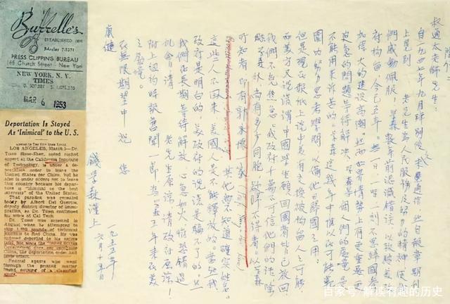 与这封信一同寄出的还有一张小简报,那是美国《纽约时报》的报道,“钱学森——加州理工学院著名的火箭专家,(1953年)3月5日在洛杉矶被命令驱逐回中国,但同时又被命令不许离开美国,因为他的离去‘不利于美国的最高利益’。”