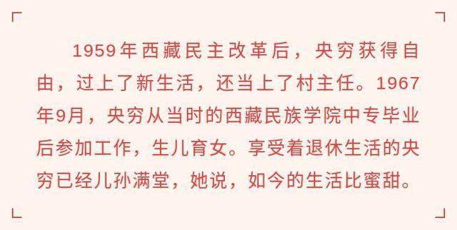 央穷8岁时开始给农奴主当差,放牧牛羊、干杂活,农奴主却不管吃穿。白天,她靠家人送去的糌粑充饥;夜里,她睡在农奴主家的羊圈或厨房角落里。12岁时,央穷逃到了日喀则市萨迦县,给当地贵族做佣人,后来又流浪到了拉孜县扎西岗乡,吃尽了苦头。