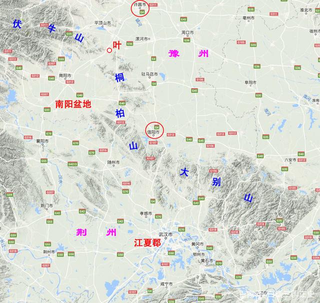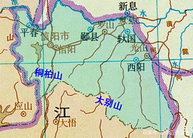 我们会发现,现在的信阳市周边一带,居然位于汉末时江夏郡的北部。结合图上的省界线,我们不难发现,江夏郡北部的平春、鄳县、轪国、西阳四县位于桐柏山、大别山之北。