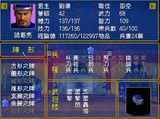 20级升迁对应的官职为太傅,司徒,司空,对应的武将技为伏兵排阵,黄龙天翔,五雷轰顶,黄龙天翔还不错,五雷为打将技能。虽然技能都还不错,但是群英1中最注重的还是武力,而这是诸葛亮欠缺的,所以在1代中诸葛亮没什么用