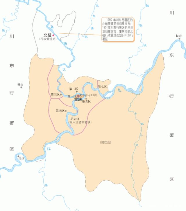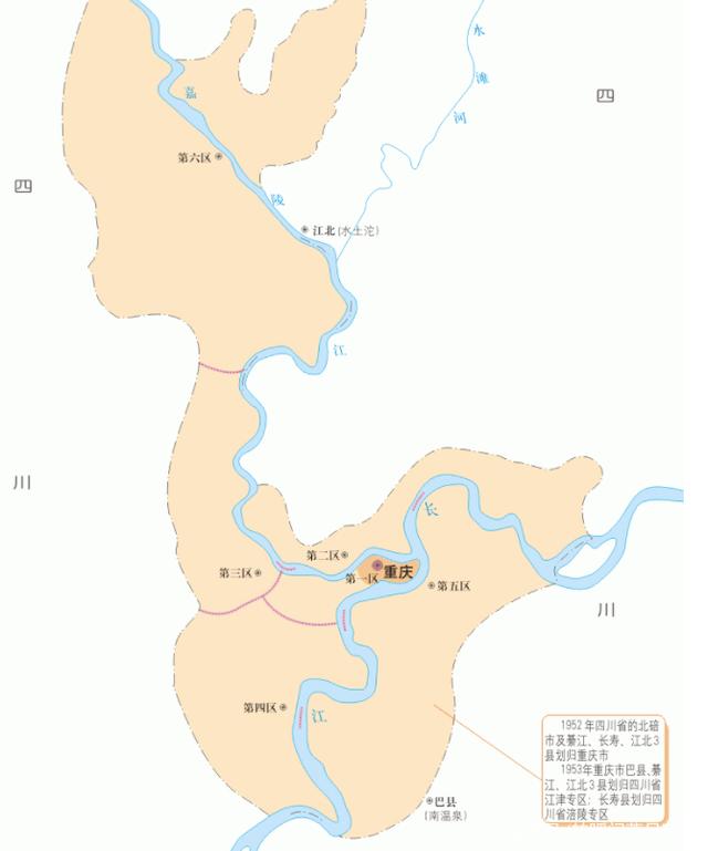 在此期间,重庆市被降级为副省级城市,隶属于四川省管理。从管理区划来说,重庆市除了管理市区之外,仅仅管理了1个巴县。后来,江北县等地区,仅仅划入了1年时间,又划入了周围的专区。这也是那个年代直辖市的特点,管辖区面积都不大。因此,后来河北省与天津市、北京市,江苏省、浙江省与上海市,出现了一系列的区划调整。