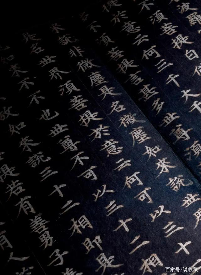 此经瓷青纸银粉书写,细阅纸质纤维粗短,呈现麻性,常有结块突兀处,为典型宋元间纸张,古意盎然。瓷青纸创制于晚唐五代,又称绀纸、碧纸、绀碧纸、绀青纸、青藤纸、碧楮纸、鸦青纸等。纸张厚实,染以靛蓝,因其色如瓷器的青釉,故称为瓷青纸。北宋黄庭坚有《求范子默染鸦青纸》诗句:“为染溪藤三百固,待渠湔拂一床书。”从古至今一直是一种名贵纸张,其价格为普通用纸百倍。全经上下金泥界栏。其书法上承唐宋以来经生体之余绪,又明显受宋人尤其是苏轼书风的影响,而不同于元代普遍流行的以赵孟为代表的妍美。书法浑厚挺拔,捺笔、撇笔及转笔处出锋锋锐。结体取横式,尤显古朴。左低右高,倚侧取势,与西夏遗民李慧月手书《华严经》有着异曲同工之妙。点画笔笔交代清晰,体现出书者扎实的楷书功底。