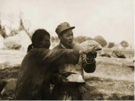 山东当地一位大娘冒着危险为我军炮兵指挥员指示炮击目标。(孟良崮战役纪念馆供图)
