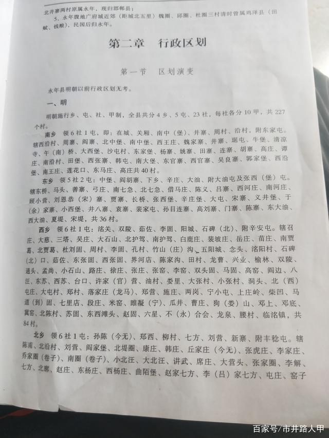 后面增加的109个村子的形成则各有原因。因为喜欢永年乡村历史,也曾探索过一段时间,就将我自己不成熟的观点说一下,不一定全对,如有不周,请多多谅解。第一原因,大村分成两个村。如西苏乡的尚村。原来就是孟尚李姓的一支,搬迁到村东成立一个村,当时叫上村,后改为尚村。还有明朝时的营里(前后马营),到清朝时,人口多了,就分成了两个村,前王马营和后王马营。还有双陵陈氏兄弟两个,明朝时,从双陵迁到何庄,后家族壮大后,单独成一村,清朝时称陈何庄。这样的村子还有很多,不再一一列举。第二个原因,有很多村子都是在清朝时才建立的。比如西杨窑村,就是双陵杨氏迁到那个地方时,才成立的新村。还有新安村,也就是现在邯郸市动物园所在的佛山就是新安村。这个村因佛光寺出名,信徒来自周边县,清末成村,原名老鸦嘴,后改山沟,1942年,改名新安村。尚庄,明朝崇祯8年,迁来为庄,起名上庄,后改为尚庄。