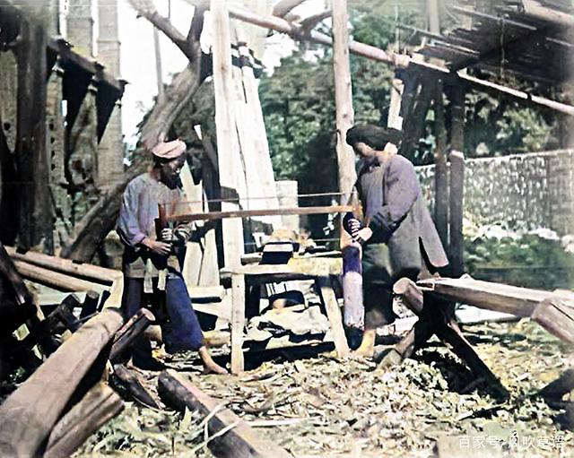 过去人们的家居生活离不开木头,大大小小的木工作坊遍地皆是。图中的两个木匠正在合力锯开一块木板,工作很辛苦,但他们都光着脚,说明收入并不高。