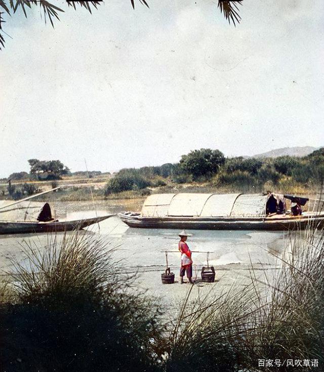 缓缓流淌的溪水上停泊着两艘带有船篷的木船,船头可见一名船夫忙碌的身影。一个挑水人手挽扁担站在岸边注视着河面,像是在凝望一点点流逝的过往。
