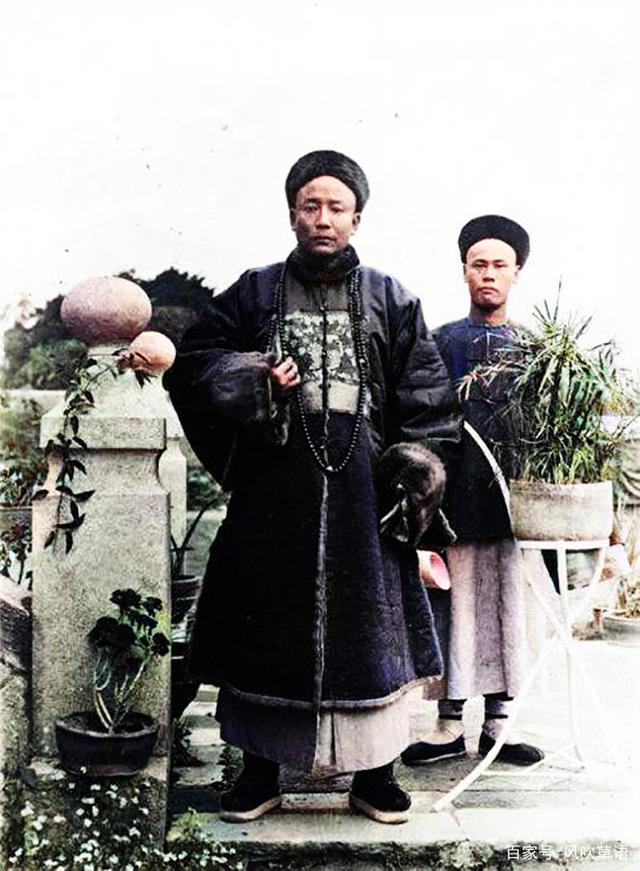 一名官员和他的随从。近景的男子身穿带有补子的官袍,胸前挂着长长的朝珠,看着威风凛凛。然而,表面的威风却难掩精神的萎靡,这是当时大部分清代官员的真实写照。