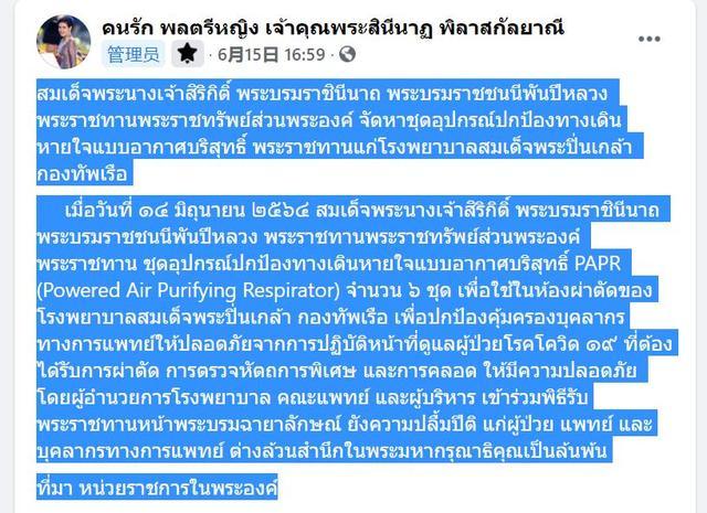 诗妮娜以皇太后的为名,向Pinklao医院门诊给予空气过滤机器设备,而且问慰了本地的医务人员。现阶段泰国依然处在特殊时期,医务人员的祸福和工资待遇备受关注,诗妮娜妃也作出了许多奉献。