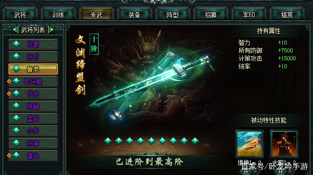 鲁肃的专武技能“文渊缔盟剑”一技能“借粮”自身以及随机队友获得屯田效果,并给予有屯田效果的我方部队一层护盾效果。二技能“大略”每回合大量地提升自己的计策伤害,可以叠加,提升效果持续31个回合。