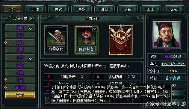 在策略游戏《卧龙吟》中,鲁肃是个紫将,他的技能“乱世奇谋”对全体敌人造成两次极高的计策伤害,第一次目标士气越低伤害越高,第二次目标士气越高伤害就越高,有20%概率使目标进入“暗祭”,持续1回合,再对士气最低的敌人造成计策伤害并降低士气,目标士气越低伤害越高,恢复自身士气。