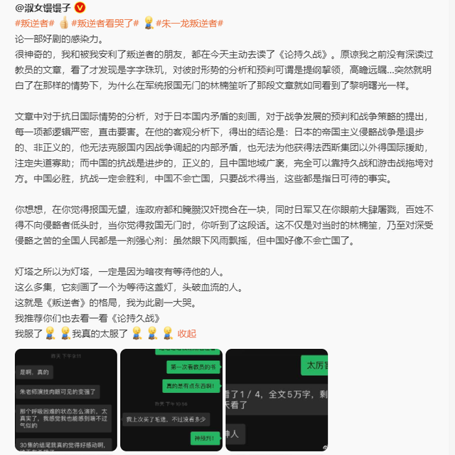 下图中这位网友是因为电视剧第一次看《论持久战》,她的感受,应该说,是大多数首次阅读毛主席文章的年轻人的共同感受。