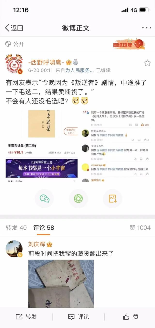 看了《叛逆者》的年轻人,竟然连夜看起了《论持久战》,甚至某网的《毛选》卷二直接被买爆了。