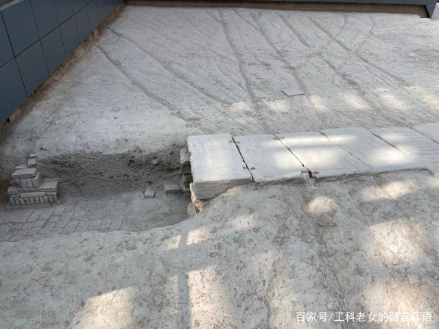 大唐西市博物馆一楼可以看到考古发掘的成果:夯实过的路面,“十字街”的石板桥,还有一千年多年前留下的深深的车辙印……。