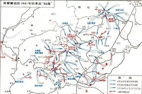 1941年的大扫荡,华北方面军有21、26、34、36、41、110六个师团派出了数量不等的部队,加上几个混成旅团,连同配合的伪军、警备队等,一共有6万多人,训练水平和弹药物资更处在绝对优势,无论聂荣臻如何精明、甚至猜出了鬼子的进攻方向,他都难以招架。