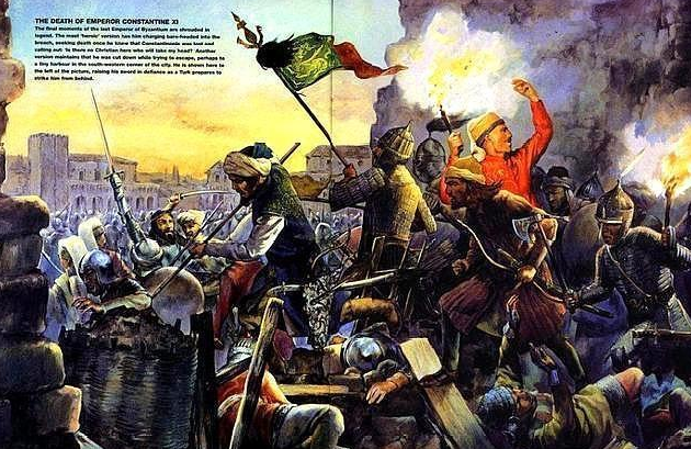 然而土耳其士兵从小门进入在墙头举旗高喊“城已破”,正在奋战的守军听到这句话,以为敌军已经攻入内城,瞬间无心作战防守,奥斯曼大帝涌入城内将守城士兵淹没,君士坦丁十一世看大势已去,决定殉国,而是用鲜血捍卫了基督最后的尊严,他脱下紫袍拔出宝剑,向着异教徒冲去,倒在了血泊之中,当天夜里土耳其人占领了君士坦丁堡全城。