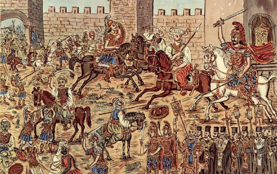 城防就出现空缺,土耳其人再次加强攻势,一波又一波的炮火将原本残缺的城墙炸的千疮百孔,君士坦丁11世亲自率兵赶往前线,和手撑指挥官一起,带领挡住了土耳其人的进攻,经过数日搏杀,所有活着的士兵到城墙进行最后一战,就在这时被流弹击中身负重伤挥挥兵抬到战船,导致军心有些动摇,皇帝本人亲自作战,鼓舞士气,便成功将敌人推下云梯。