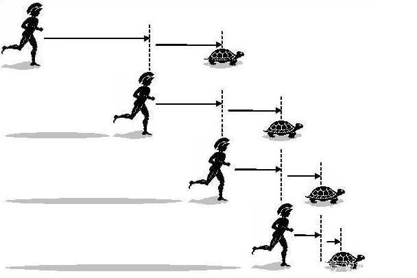 而芝诺最为著名则是他的阿基里斯永远追不上乌龟的悖论,阿基里斯是古希腊神话中善跑者,但是却永远追不上速度比他慢十倍的乌龟,其悖论如下: