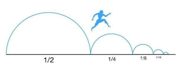 芝诺的二分法—在芝诺看来:“一个人从A点出发走到B点,要先走完总路程的1/2,再走完剩下总路程的1/2,再走完剩下的1/2……”如此循环往复,走完一个二分之一,还有下一个二分之一,所以在芝诺看来,运动是不可能的。